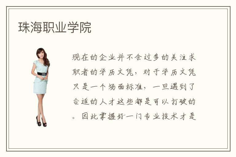 现在的企业并不会过多的关注求职者的学历文凭,对于学历文凭只是一个场面标准,一旦遇到了合适的人才这些都是可以打破的。因此掌握好一门专业技术才是未来顺利就业的根本保障,那么珠海职业学院的专业课程教学培训效果怎么样呢?珠海职业学院位于我国的深圳市,是一所开设了很多年的专业技术培训中心,特色化的专业课程教学方式也使得珠海职业学院深得珠海市民的信任。