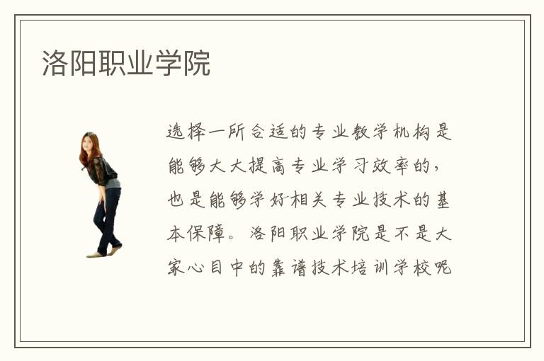 选择一所合适的专业教学机构是能够大大提高专业学习效率的,也是能够学好相关专业技术的基本保障。洛阳职业学院是不是大家心目中的靠谱技术培训学校呢?洛阳职业学院的教学质量还是很可靠的,要想进入各行各业找到满意的工作,就需要洛阳职业学院的专业化培训。从洛阳职业学院与各大企业都有长期稳定的合作,因此对于洛阳职业学院的毕业生来说,就业工作的机会也就更多了。