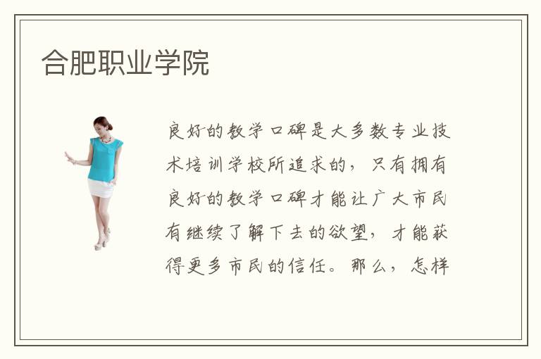 良好的教学口碑是大多数专业技术培训学校所追求的,只有拥有良好的教学口碑才能让广大市民有继续了解下去的欲望,才能获得更多市民的信任。那么,怎样才能拥有良好的教学口碑呢?合肥职业学院的口碑好不好呢?合肥职业学院拥有国内一流的专业技术培训团队,通过专业化的培训顺利培养了很多优秀的技术型人才,合肥职业学院是用自己的教学实力获得的好口碑。