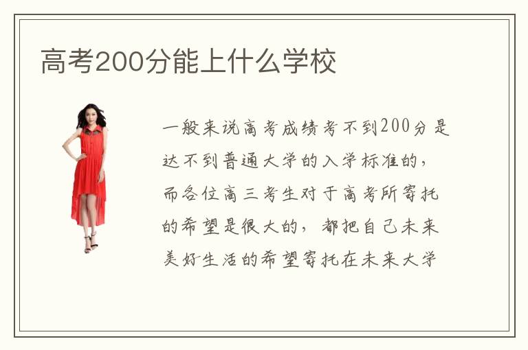 一般来说高考成绩考不到200分是达不到普通大学的入学标准的,而各位高三考生对于高考所寄托的希望是很大的,都把自己未来美好生活的希望寄托在未来大学上。那么,你知道高考200分能上什么学校呢?高考200分的同学可以选择一些专业技术培训学校,现在各大都成立了很多专门培养学生技术水平的机构,这些学校正是适合高考落榜的同学去学习专业技术的。