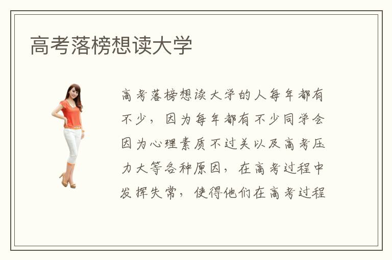 高考落榜想读大学的人每年都有不少,因为每年都有不少同学会因为心理素质不过关以及高考压力大等各种原因,在高考过程中发挥失常,使得他们在高考过程中落榜。因此,考不上理想的大学就成为了这些人的遗憾。高考落榜也是可以读大学的,那么,高考落榜想读大学怎么办呢?高考落榜的同学可以考虑一下“成人高考”,每年也存在很多人通过成人高考顺利考上大学的事件。