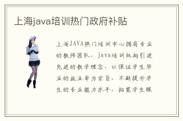 上海JAVA热门培训中心拥有专业的教师团队,java培训机构引进先进的教学理念,以保证学生毕业的就业率为宗旨,不断提升学生的专业能力水平,拓宽学生眼界以达到开拓思维模式的效果。对于上海java热门培训,政府是否有所政策出台?上海JAVA培训热门政府补贴范围是多少?上海地区JAVA培训机构热门政府补贴是多少?java上海培训热门培训项目有许多,根据学生的不同需求进行尽可能的分配磨合。