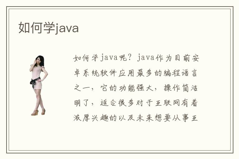 如何学java呢?java作为目前安卓系统软件应用最多的编程语言之一,它的功能强大,操作简洁明了,适合很多对于互联网有着浓厚兴趣的以及未来想要从事互联网职业的人学习的首选。学习java专业是一个枯燥的过程,需要大家耐下心来,也要学会坚持,要踏踏实实的从基础语法开始练习,逐渐开发设计一些小型的应用软件,这些都能给你丰富的实践操作经验。