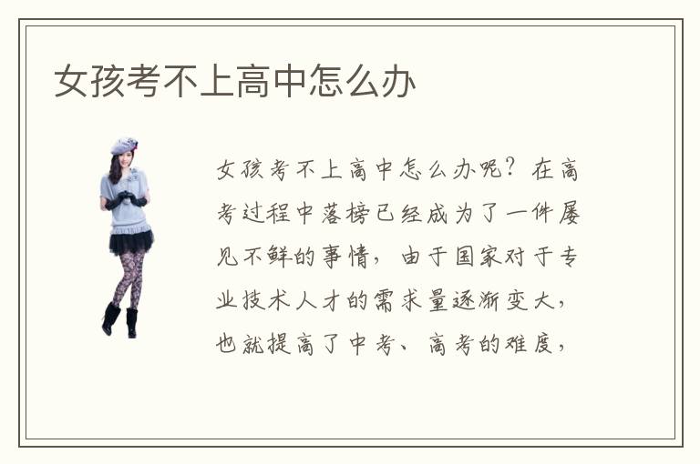 女孩考不上高中考不上高中怎么办呢?在高考过程中落榜已经成为了一件屡见不鲜的事情,由于国家对于专业技术人才的需求量逐渐变大,也就提高了中考、高考的难度,因此每年都存在很多在中考、高考中落榜的同学。在中考落榜的人群中,男生的比例是小于女生比例的,那么女孩考不上高中怎么办呢?女生在设计方面是具有先天优势的,因此可以选择学习一些当下比较热门的与设计相关的专业学习。