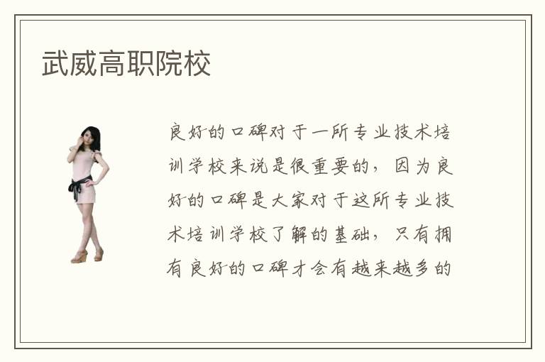 良好的口碑对于一所专业技术培训学校来说是很重要的,因为良好的口碑是大家对于这所专业技术培训学校了解的基础,只有拥有良好的口碑才会有越来越多的同学对这所专业技术培训学校产生信任。那么,武威高职院校的口碑怎么样呢?武威高职院校是不是一所比较靠谱的专业技术培训学校呢?武威高职院校拥有国内一流的专业教学团队,合理的专业课程安排使得武威高职院校拥有良好的口碑。
