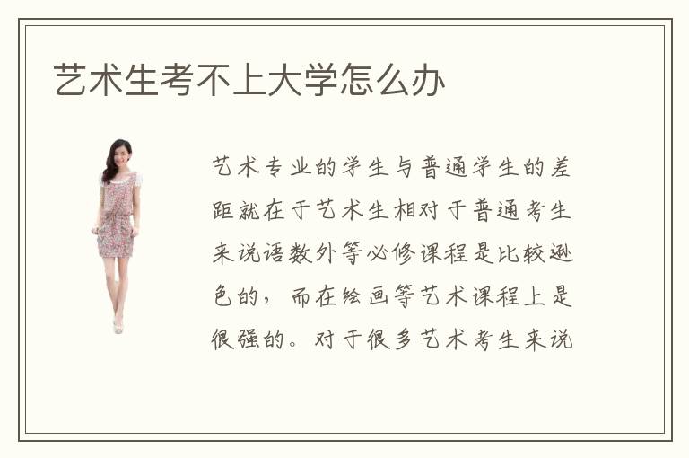 艺术专业的学生与普通学生的差距就在于艺术生相对于普通考生来说语数外等必修课程是比较逊色的,而在绘画等艺术课程上是很强的。对于很多艺术考生来说高考是比较难的,她们更擅长的是绘画等艺术类别的考试,那么艺术生考不上大学怎么办呢?艺术生考不上大学可以从自己的专业特长出发,可以进入到专业的培训机构选择适合自己的专业学习,当下艺术设计类的专业课程也是很抢手的。