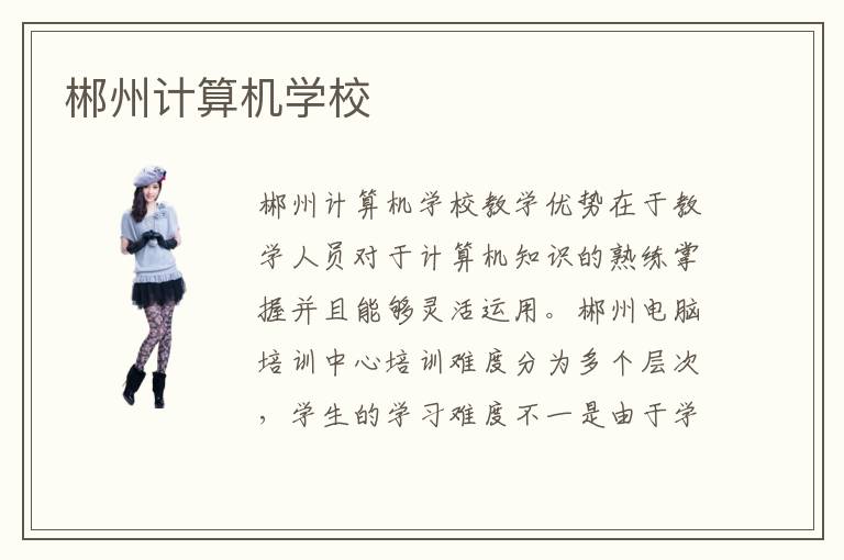 郴州计算机学校教学优势在于教学人员对于计算机知识的熟练掌握并且能够灵活运用。郴州电脑培训中心培训难度分为多个层次,学生的学习难度不一是由于学生自己的受教育程度不同以及自己的计算机水平基础不一样所导致。郴州计算机电脑培训机构价格多少?郴州电脑训练平台给了大家一个充分学习、互相沟通交流的和谐场所,大家可以收获更多的知识。