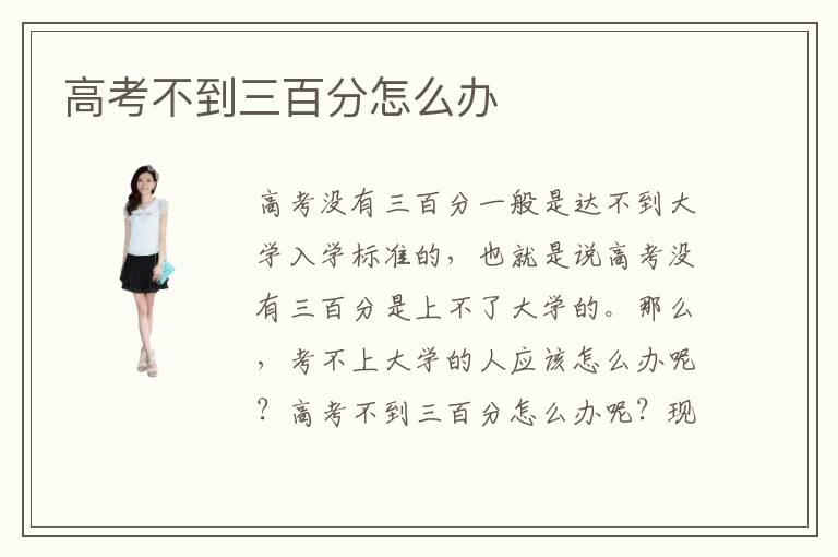 高考没有三百分一般是达不到大学入学标准的,也就是说高考没有三百分是上不了大学的。那么,考不上大学的人应该怎么办呢?高考不到三百分怎么办呢?现在各大企业更看中的是员工的专业技术水平,因此掌握一门专业技术是未来就业的根本保障,掌握好一门专业技术也是很有必要的。高考不到三百分的同学可以根据自己的情况以及未来社会的发展形势,选择一门合适的专业进行学习。