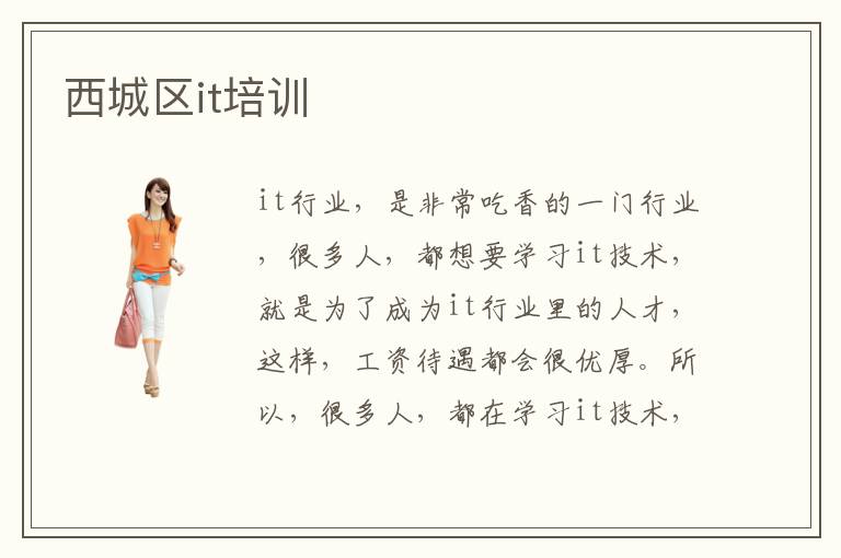 it行业,是非常吃香的一门行业,很多人,都想要学习it技术,就是为了成为it行业里的人才,这样,工资待遇都会很优厚。所以,很多人,都在学习it技术,而学习it技术,得到专业的培训机构,去学习才可以。西城区it培训it培训机构就都是一些关于it方面的专业培训机构。在西城区it培训机构里面学习,完全可以放心,一定可以学到专业知识。西城区it培训机构培训质量,非常的高,每年都会培训出大量的人才学员,这些学员,都取得了不错的成就。所以,学习it技术最好的方法就是到西城区it培训机构里面学习。西城区it培训班有着非常多的经验,在西城区it培训班里面学习会非常的轻松。想要学习it技术就选择西城区it培训班,学习。
