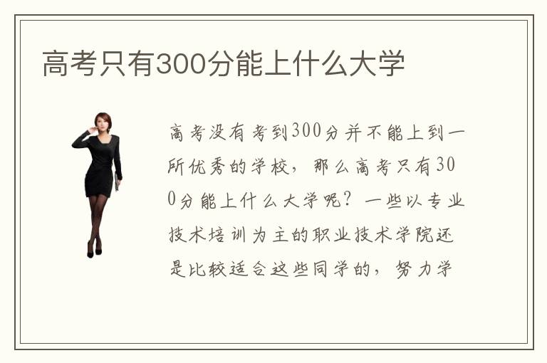高考没有考到300分并不能上到一所优秀的学校,那么高考只有300分能上什么大学呢?一些以专业技术培训为主的职业技术学院还是比较适合这些同学的,努力学好专业技术对于未来就业是很有帮助的。职业技术学院的教学培训目的很明确,成立的主要目的就是为了培养更多强专业、高技术并且经验丰富的技术人才,充分保障了在校学员的就业安全,同时也为国内各个地区的经济水平发展能力做出了很大的贡献。