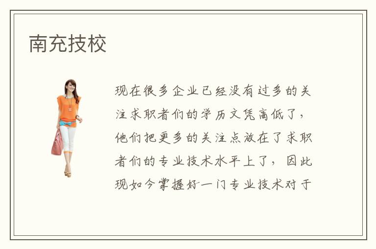 现在很多企业已经没有过多的关注求职者们的学历文凭高低了,他们把更多的关注点放在了求职者们的专业技术水平上了,因此现如今掌握好一门专业技术对于今后的就业发展是大有帮助的。怎样才能学好相关专业技术呢?南充技校作为一所专业的技术培训学校,总的来说,在南充专业技术培训学校的教学还是比较可靠的,想要学习专业技术的同学可以考虑进入南充技校进行学习。