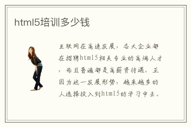 互联网在高速发展,各大企业都在招聘html5相关专业的高端人才,而且普遍都是高薪资待遇。正因为这一发展形势,越来越多的人选择投入到html5的学习中去。这些计算机相关专业的课程都是比较枯燥无味的,对于大多数人我还是推荐大家去专业的html5培训机构学习。四个月的高效培训,加强你的html5技能,将你打造成html5编程高手。那么,html5培训需要多少钱呢?