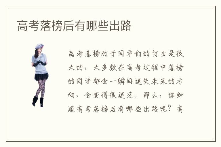 高考落榜对于同学们的打击是很大的,大多数在高考过程中落榜的同学都会一瞬间迷失未来的方向,会变得很迷茫。那么,你知道高考落榜后有哪些出路呢?高考落榜的出路一般有这几种,第一种是在当今社会找到一份并不注重学历的工作。第二种是比较支持的,就是观察社会市场发展的趋势,选择合适的专业技术进行学习。这对于今后的就业发展是大有帮助的,当然首先要找到靠谱的专业技术培训学校。