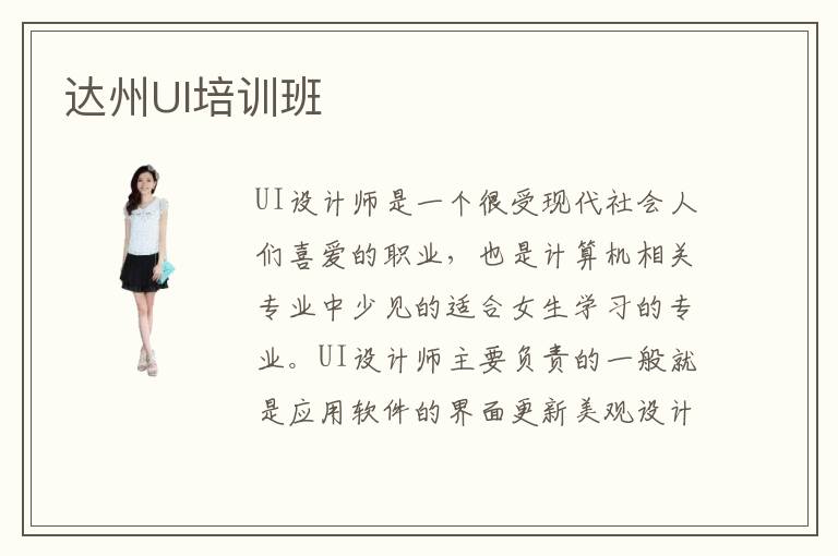 达州市位于我国的达州省,众所周知达州省是我国的一大经济发展重点城市,便利的交通以及密集的人口使得达州成为了一个很多年轻人想要去闯荡的城市。达州也在紧随国内信息化发展的脚步,开设了很多计算机相关的培训班。UI设计专业的学习需要找对学习方法,就需要选择口碑好的培训机构。那么,你知道达州有哪些知名的UI培训班吗?这些知名的UI培训班地理位置在哪呢?