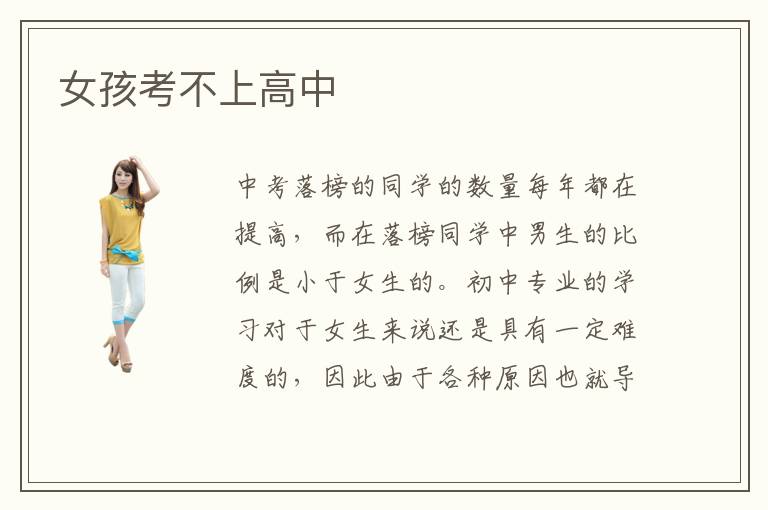 中考落榜的同学的数量每年都在提高,而在落榜同学中男生的比例是小于女生的。初中专业的学习对于女生来说还是具有一定难度的,因此由于各种原因也就导致了女生高考落榜率比较高,那么女孩考不上高中考不上高中怎么办呢?女生相对于男生来说,在审美能力上是比较靠谱的,因此女孩考不上高中可以选择去专业的培训机构进行美术设计方面的学习,这类专业当然就业前景也是很不错的。