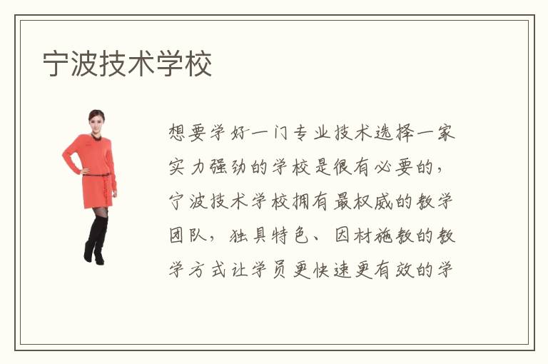 想要学好一门专业技术选择一家实力强劲的学校是很有必要的,宁波技术学校拥有最权威的教学团队,独具特色、因材施教的教学方式让学员更快速更有效的学好专业技术。宁波技术学校通过风趣幽默的课堂教学,让学生拥有了对于专业技能的学习兴趣,让学生在潜移默化中不断提升自己的专业技能,宁波技术学校也是宁波地区广大学子学习技能专业互相交流探讨的平台。