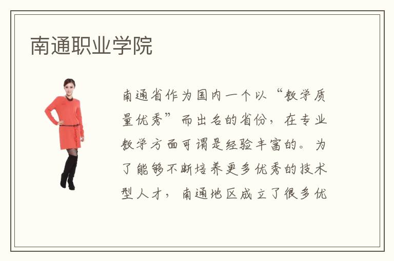 现在的企业并不会过多的关注求职者的学历文凭,对于学历文凭只是一个场面标准,一旦遇到了合适的人才这些都是可以打破的。因此掌握好一门专业技术才是未来顺利就业的根本保障,那么南通职业学院的专业课程教学培训效果怎么样呢?南通职业学院位于我国的南通市,是一所开设了很多年的专业技术培训中心,特色化的专业课程教学方式也使得南通职业学院深得南通市民的信任。