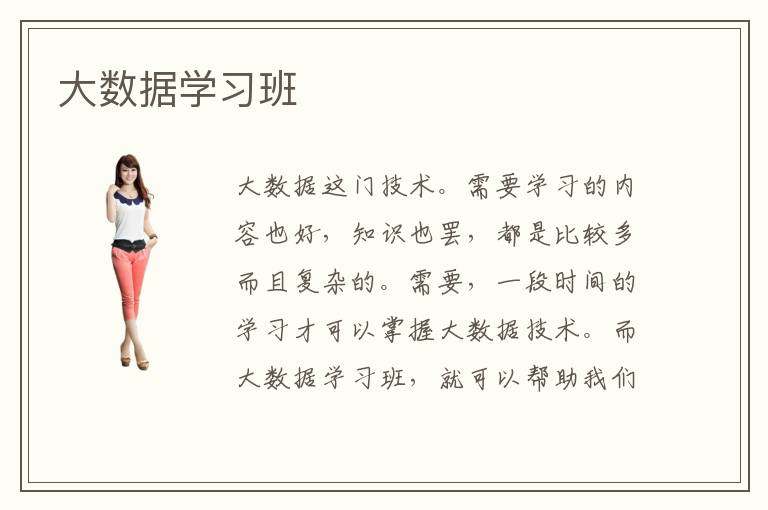 大数据这门技术。需要学习的内容也好,知识也罢,都是比较多而且复杂的。需要,一段时间的学习才可以掌握大数据技术。而大数据学习班,就可以帮助我们,快速的,学会大数据技术。在大数据学习班里面,学习环境还是比较轻松一点的。比起自己闷头苦学。不如到大数据学习班和大家集体学习,要学得快一些。而且在大数据学习班里面学习大数据技术,效率也非常的高。也就是说大数据学习班可以保质保量的,让你学会大数据技术。只有真正的学会,大数据技术,才可以从事大数据相关行业的工作。也能够对自己的用人单位说,自己是大数据方面专业的人才。大数据学习班有很多呀。挑选其中的,一个大数据学习班,就能帮助你学的快一些。在大数据学习班里面学习大数据一天。比你自己在家里学习一个月,要学的内容又多又专业。