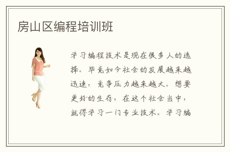 学习编程技术是现在很多人的选择。毕竟如今社会的发展越来越迅速,竞争压力越来越大。想要更好的生存,在这个社会当中,就得学习一门专业技术。学习编程技术最好的地方是房山区编程培训班。房山区编程培训班,培训经验非常的多。有很多人都在这里培训学习。而且在房山区编程,培训班里面学习编程技术,学到的都是非常专业的知识。所以有越来越多的人都选择到房山区编程培训班里学习编程技术。房山区边上培训班经验丰富。培训过的人员也非常的多。这些学员也都取得了不错的成绩。房山区编程培训班,教师团队也都是专业的。这些教师也都是专业性人才。所以培养出的学员也都是非常专业的人才。房山区编程培训班,有着非常先进的培训设施。在这里学习完全可以放心,能学到非常多的专业知识。