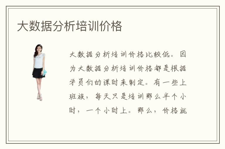 大数据分析培训价格比较低。因为大数据分析培训价格都是根据学员们的课时来制定。有一些上班族,每天只是培训那么半个小时,一个小时上。那么,价格就会低一些。就算说每天都进行大数据分析培训。大数据分析培训价格也不高。大家都可以承受得了。进行大数据分析培训有必要吗?进行大数据分析培训,非常的有必要。可以,快速的学会大数据分析这门技术。大数据分析培训,价格的高低并不重要。重要的是一定要进行大数据分析培训。才可以更好的掌握大数据分析技术。大数据分析培训价格,方面就是这样子的。有一些学员经过大数据分析培训之后,成了一些专业性的人才。而且掌握到的大数据分析知识,都是专业的知识。所以才说大数据分析培训,非常的有必要。