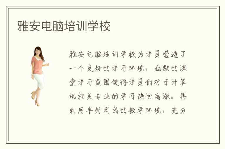 雅安电脑培训学校的教学水平不用多说自然是值得信赖的,因为在雅安雅安电脑培训学校是大家学习计算机相关专业的首选学校,在雅安市民心中有着很重要的地位。雅安电脑培训学校良好的口碑主要来自于雅安电脑培训学校对于学员们的优质的教学,当然还有雅安电脑培训学校超高的就业成功率。雅安电脑培训学校给予学员们最大的就业保障,通过专业技术的认真学习会有很多与国内知名企业合作的机会。