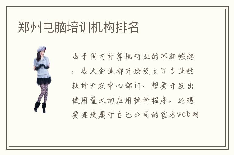 由于国内计算机行业的不断崛起,各大企业都开始设立了专业的软件开发中心部门,想要开发出使用量大的应用软件程序,还想要建设属于自己公司的官方web网站。因此对于计算机专业的人才需求量是巨大的,但是很少有求职者可以通过企业的面试,最根本的原因还是因为技术不过关,并没有掌握it技术的精髓。郑州地区的人也不除外,那么,你了解郑州电脑培训机构电脑培训机构排名吗?