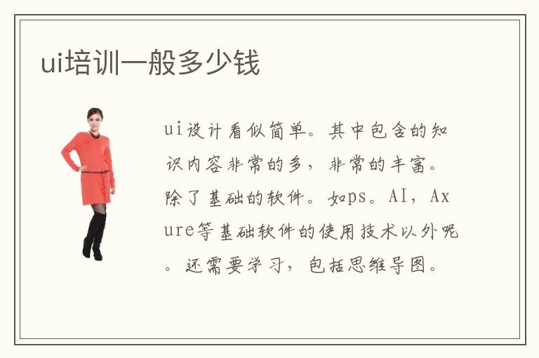 ui设计看似简单。其中包含的知识内容非常的多,非常的丰富。除了基础的软件。如ps。AI,Axure等基础软件的使用技术以外呢。还需要学习,包括思维导图。原型图还有交互逻辑规范,切图,了解程序与用户体验,还有营销课程方面的内容。所以选择到正规的教学内容是比较全面的,学到的技术也很多。还有一些小机构,虽然学费低,但是内容涵盖量却很少。既然想进行ui培训。就不要把重心放到ui培训一般多少钱上。不能以价格的高低来决定培训机构,带给你知识量的多少。虽然大部分培训机构收费标准都在1万左右。但也免不了有一些骗子机构,就会用高价的费用,把你骗进去。不对你进行培训。所以说价格方面不是最重要的。重要的是你能在这些培训机构里面学到些什么?一定要考虑好再去进行培训。