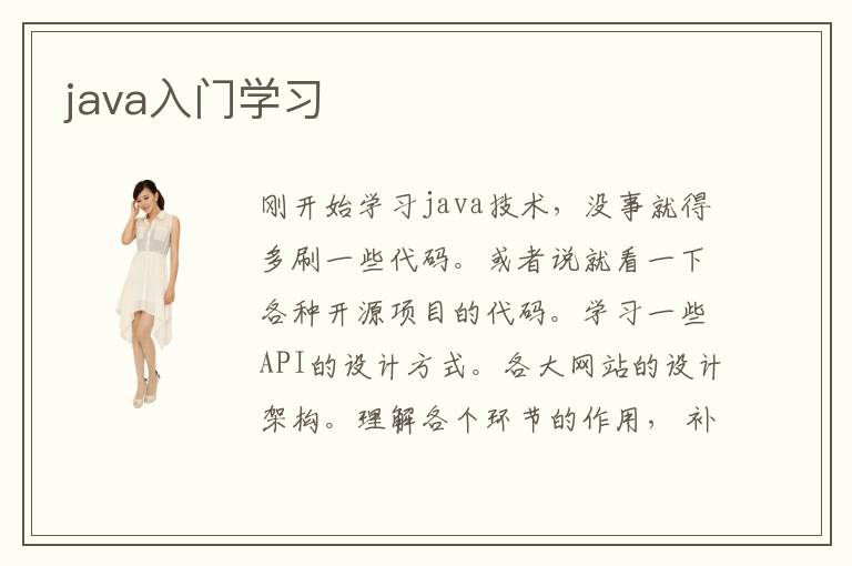 刚开始学习java技术,没事就得多刷一些代码。或者说就看一下各种开源项目的代码。学习一些API的设计方式。各大网站的设计架构。理解各个环节的作用, 补充自己的知识库存。java入门学习内容有,java简介,就是了解什么是java,代码语法基本格式,输出表达式。了解java大致的编译以及执行过程。java语言基础,循环,数组,了解类和对象,掌握java的基本数据类型和引用数据类型有哪些, 掌握强制数据类型转换和自动类型提升规则。常量如何声明及赋值,循环的语法及作用。数组的声明及定义。掌握类的概念以及什么是对象等等,这些,基础知识掌握之后就完成了java入门学习。接下来就可以进一步学习难度较高的一些知识内容。