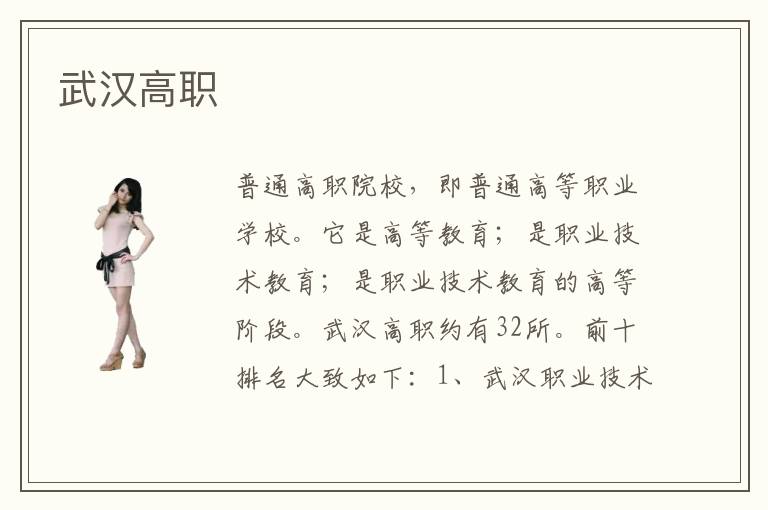 普通高职院校,即普通高等职业学校。它是高等教育;是职业技术教育;是职业技术教育的高等阶段。武汉高职约有32所。前十排名大致如下:1、武汉职业技术学院2、武汉外语外事职业学院3、武汉纺织大学外经贸学院4、武汉航海职业技术学院5、武汉民政职业学6、武汉交通职业学院7、长江职业学院8、武汉软件职业学院9、武汉语言文化职业学院10、武汉电力职业技术学院。当我们选择武汉高职时,需要考虑的不仅仅是学校排名,同时我们要考虑的因素还有很多,列如,父母期许,专业兴趣,学校规模,就业前景,学习氛围等诸多方面的因素。有些人说,读了武汉高职是放弃了未来,这是极其错误的,要相信,天生我材必有用,常说学好数理化,走遍天下都不怕,三百六十行,行行出状元,无论何时何地,只有掌握了实用的技术,都会有前途。武汉高职也能让我们为未来走上社会打下良好的基础。