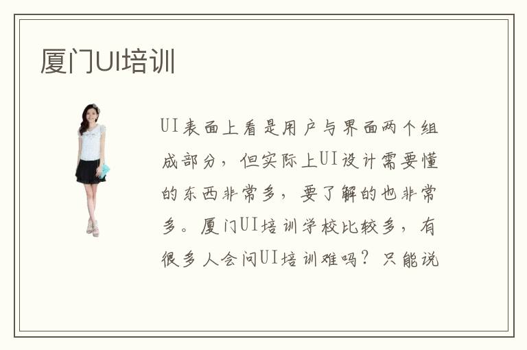 UI表面上看是用户与界面两个组成部分,但实际上UI设计需要懂的东西非常多,要了解的也非常多。厦门UI培训学校比较多,有很多人会问UI培训难吗?只能说会者不难,难者不会。如果报培训班的,跟着老师一起学习的的话,相对可能会轻松一下,但是自己必须用心学习。我们学习的人能做的就是,遇到什么问题,就去解决问题。从最简单的最基础的学习开始,加上时间、经验的积累,让UI培训变得不再那么难。UI设计最基础的就是PS、平面设计、用户体验设计等等,好的UI设计,会让软件的操作变得实用、简单。厦门UI的就业前景也是很理想的。UI设计师在、游戏软件、广告设计、医疗、科技、交通、通都有非常好的发展空间,在厦门有很多优秀的企业,甚至小到一个创业的小公司。都需要UI设计师这样的人才。现在是网络时代。工资方面也不错,从你刚毕业的5K-8K,到后面的年薪几十万都有。
