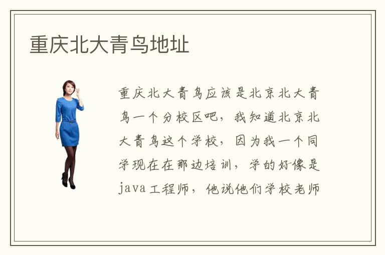 重庆北大青鸟应该是北京北大青鸟一个分校区吧,我知道北京北大青鸟这个学校,因为我一个同学现在在那边培训,学的好像是java工程师,他说他们学校老师还不错,都是研究生以上学历,而且还要有五年项目经验通过什么资格证才能进去,他个人觉得授课还是不错的,说的案例都是最新的,这点比较好,及时更新知识体系,不至于毕业后所学的都淘汰了,还有他们学校环境不错,学习气氛不错,重庆北大青鸟地址我是不知道,这个一般网上都可以找到的,重庆北大青鸟地址应该不会偏远,现在这类培训机构都是依靠很多大学设立的,有一定资源优势,地理位置利用的好,才好招生啊,这一点还是给他点赞的,如果你不着急要重庆北大青鸟地址的话,我可以找到再来告诉你,哈哈,或者我查到你已经了解过了
