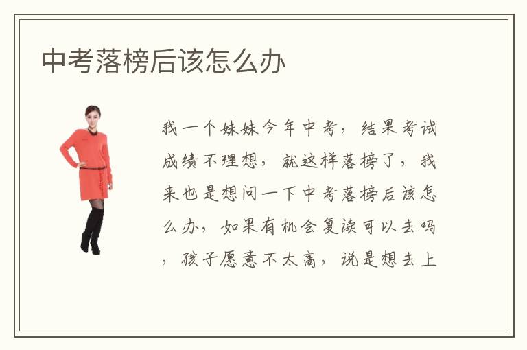 我一个妹妹今年中考,结果考试成绩不理想,就这样落榜了,我来也是想问一下中考落榜后该怎么办,如果有机会复读可以去吗,孩子愿意不太高,说是想去上普通高中,就担心课程跟不上,自己基础不好,自己这个考试结束后心里都焦虑,中考落榜后该怎么办的补救办法,我知道心态最重要,可是不知道该怎么劝说,她还在纠结中考落榜后该怎么办这个问题中,我建议出去散散心也好,放松一下慢慢决定,毕竟人生的路还很长很长,这只是很小的一个挫折,如果说中考落榜后该怎么办的补救办法,我个人觉得了解自己的优势在哪里,如果对学习兴趣浓厚,可以选择普通高中或者补习,如果不喜欢学习文化课,可以考虑一下上职业学院,至于大学梦实现,现在不是有专升本考试的嘛,你可以去了解一下,有机会就可以去参加这类考试的,拿到的证书也是被认可的