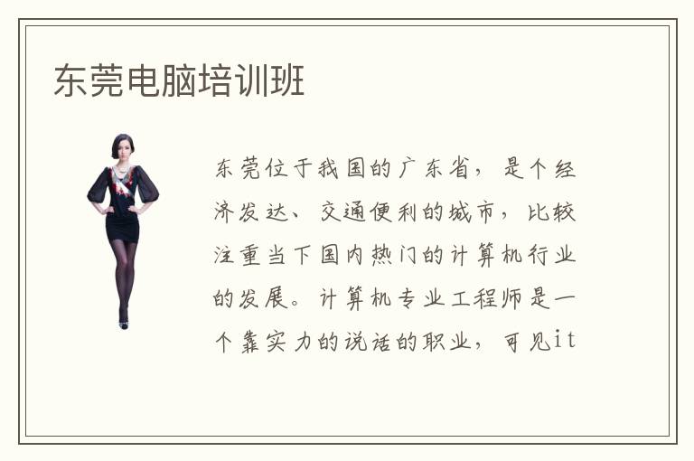 东莞位于我国的广东省,是个经济发达、交通便利的城市,比较注重当下国内热门的计算机行业的发展。计算机专业工程师是一个靠实力的说话的职业,可见it技能对于一名优秀的计算机程序员来说是很重要的,因此不断提升自己的计算机专业技术能力,是一名优秀的计算机专业工程师必备的素质。东莞电脑培训班是一个可以与时俱进的提升自己的计算机专业技能的平台。