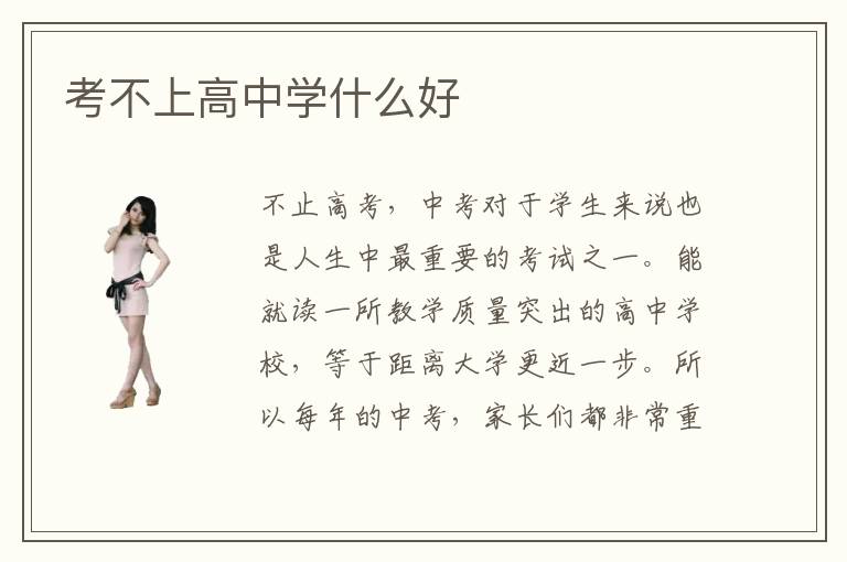 不止高考,中考对于学生来说也是人生中最重要的考试之一。能就读一所教学质量突出的高中学校,等于距离大学更近一步。所以每年的中考,家长们都非常重视。有的同学由于种种因素,在考试时发挥失常,没能考出理想的成绩,无缘高中。考不上高中学什么好?其实,大学也并非改变命运的唯一途径。中考失利的情况下,同学们可以考虑就读高职院校,或者职业技术学校,学习一门专业技术。高职院校毕业的学生,由学校统一颁发国家职业技术证书,并且由学校方安排实习就业。减轻就业方面压力。考不上高中学什么专业好?每个人特长与性格不同,所以也就适合不同的专业。比如对理科感兴趣的同学,可以学习计算机专业,会计专业等。文科特长生可以从事艺术设计类专业、学前教育专业等等。考不上高中学什么好就业?无论热门行业也好,传统行业也罢。每个岗位都需要专业人才,干得好都是有发展空间的。我们要关注的是对专业技术的掌握,而不在于行业的热度。