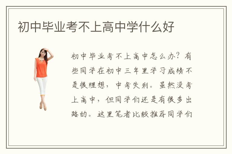 初中毕业考不上高中怎么办?有些同学在初中三年里学习成绩不是很理想,中考失利。虽然没考上高中,但同学们还是有很多出路的。这里笔者比较推荐同学们选择职业技术学校,掌握一门技术,终身受益。初中阶段正是学习的好时机,对知识掌握的能力强,是学习专业技能最好的时机。初中毕业考不上高中学什么好?对于技能的选择,这要看个人的性格与爱好。那么初中毕业考不上高中学什么专业好?在选择时要根据市场需求,热门职业在未来就业方面会更占优势。比如说:厨师、汽修专业、计算机专业、艺术设计专业、电子商务专业等等,在当前都属于热门行业。而且,现大多数职业学校,招生都实行毕业包分配,包就业的条件,这样给同学们又多增加了一份保障。最后,同学们可以根据自身特点,挑选适合自己的专业。