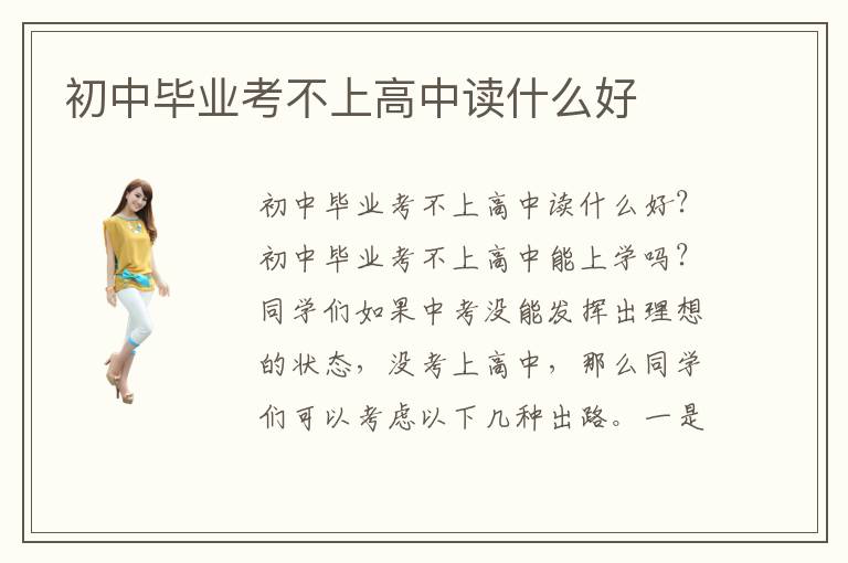 初中毕业考不上高中读什么好?初中毕业考不上高中能上学吗?同学们如果中考没能发挥出理想的状态,没考上高中,那么同学们可以考虑以下几种出路。一是复读初三,然后再参加一次中考。这个方式比较适用于一次发挥失常的同学,如果本身成绩就很差,即使复读一年效果也不会明显。二是读职业高中。应届初中毕业生正好可以就读职业高中。三是读中专学校。中专学校的优势在于入学门槛低。四是选择技工学校。技工学校则主要培养职业技术人员为主。初中毕业考不上高中读什么专业?在专业选择上,同学们应该优先考虑热门行业。优点在于好就业、且薪资待遇优厚。目前比较热门的专业有、计算机专业、医药卫生专业、中医保健专业、艺术设计专业、外语专业、电子商务专业、财会专业、旅游专业等等,都是不错的选择。