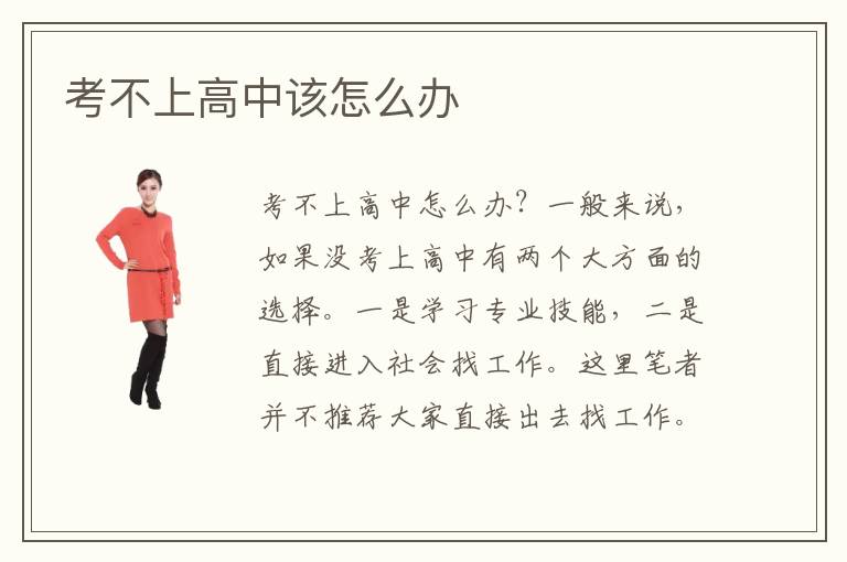 考不上高中怎么办?一般来说,如果没考上高中有两个大方面的选择。一是学习专业技能,二是直接进入社会找工作。这里笔者并不推荐大家直接出去找工作。因为初中毕业生无论从社会经验以及学历方面,根本不具备任何优势,可以说毫无竞争力。只能从事一些简单繁重的体力劳动,收入微薄,发展空间非常小。所以趁此时要掌握一门职业技术。考不上高中还能上学吗?答案是肯定能的。一,同学们可以选择复读初三,再参加中考。二、如果你是应届毕业生,但是不想再复读,那么可以上职业高中,职高的招生对象正好是应届初中毕业生。三,上中专学校。中专学校的重点在于对某个职业技能的培训,所以并不看重同学们的考试成绩,入学门槛低。四,上技工学校。技工学校毕业学校直接为学生颁发职业技术资格认证书,同学们可以凭此证直接上岗工作。所以,即使考不上高中的出路还是有很多的。