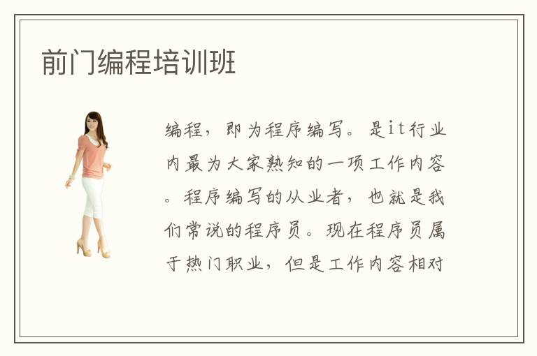 编程,即为程序编写。是it行业内最为大家熟知的一项工作内容。程序编写的从业者,也就是我们常说的程序员。现在程序员属于热门职业,但是工作内容相对枯燥乏味,整日对着电脑,在键盘上敲敲打打。虽然工作辛苦,但是在薪酬待遇方面还是不错的。目前一线城市的it从业者普遍的薪资都可以达到六千元以上。从业经验丰富者,那么月入几万都是很正常的事。并且工作中如果成绩优异,晋升的空间也非常大。总之,it行业是一个不错的就业方向。前门编程培训班,前门附近编程培训班。前门作为北京市内繁华地段,附近自然有各种教育机构,培训内容包含了各种行业,自然有专业从事it教育的培训机构。在前门附近地区至少有十几家从事it教育的培训班。在选择的时候,同学们一定要多多用心。其实正规的教育机构的教学水平都是有保证的,只是对教学内容等细节方面问题,同学们最好自己实地感受一下,毕竟只看宣传与网上的评论是难以对培训机构的整体环境做到一个客观实际的了解。前门附近编程培训班收费。每家培训机构的收费标准都是不同的,并且还要根据课程内容来决定,所以没法具体回答。