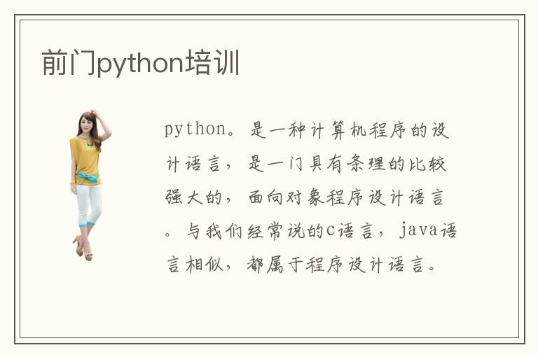 python。是一种计算机程序的设计语言,是一门具有条理的比较强大的,面向对象程序设计语言。与我们经常说的c语言,java语言相似,都属于程序设计语言。它发行于1991年,由guido van rossum设计。凭借独特的简洁性以及易读性和可拓展性。Python语言在二零一零年被评价为2010年年度最佳编程语言。掌握python语言,可以从事it相关的工作,像软件开发,程序编写等等。前门python培训。前门属于北京市的中心地段,比较繁华。有多家从事it教育的培训机构。前门python培训学校。前门附近的同如果想要报名培训机构,那么北大青鸟是一个不错的选择。它是一家全国连锁的专业it培训机构,教学质量以及口碑都算不错的。前门python培训就业。掌握python语言后,未来可以从事it相关工作,包括软件开发,程序编写等等。而it行业也是比较发展前景的,薪资待遇也不错。