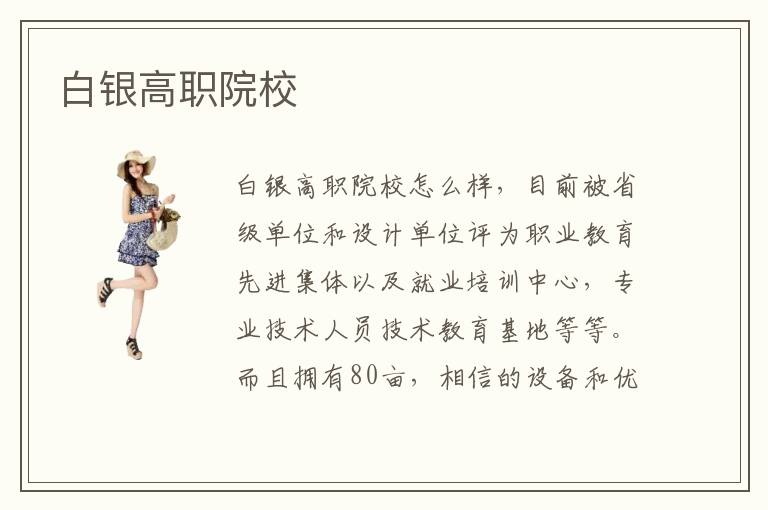 白银高职院校怎么样,目前被省级单位和设计单位评为职业教育先进集体以及就业培训中心,专业技术人员技术教育基地等等。而且拥有80亩,相信的设备和优良的资源配备一系列的时间最低,包括实验楼,教学楼,综合楼等等,而且拥有计算机开发,互联网电子科技,汽修等专业的实验器材和实验室,有助于让孩子培养身心的理念以及实践的精神。白银高职院校教育资源是非常优越的,比如教职工有110元,高级教师14人,其中硕士学位的教师占60%以上,而且开设了数控技术,电工与电气技术应用,计算机应用等等,都是目前非常热门的行业。白银高职院校成立于1984年,具有几十年的教育经验,是一所集学历教育以及职业培训综合的职业技术培训机构,目前已经先后培训各种人才7000多名,为当地的社会发展以及经济的建设提供了人才的资源。