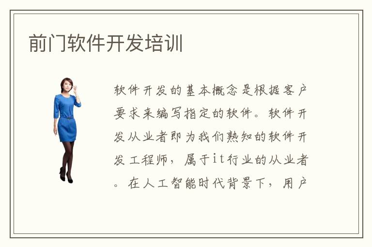 软件开发的基本概念是根据客户要求来编写指定的软件。软件开发从业者即为我们熟知的软件开发工程师,属于it行业的从业者。在人工智能时代背景下,用户的需求越多样,软件的内容越丰富。尤其是移动端,从工作到生活,再到休闲娱乐。各种软件的功能也越来越强大。而一款优秀的APP,也可以让一家公司在市场竞争中迅速崛起。国内外各大公司都在不断研发新的移动端app。这样的市场环境就意味着需要更多的软件开发工程师。所以软件开发工程师是一个非常具有发展前景的职业。学习软件开发成为了一种不错的选择。前门软件开发培训。前门是北京市的繁华地段,可以说是中心点。附近自然有专业从事it教育的机构,也就是我们说的it培训学校。前门软件开发培训班有哪些?在前门附近,比较知名的it培训机构就是北大青鸟。前门附近就是他们的全国连锁总校区。前门软件开发培训班哪家好?北大青鸟作为一家全国连锁的职业it教育机构,也就是it培训学校,他的口碑还是不错的,学费方面也是透明的。具体教学环境自己教学风格等细节问题,同学们最好可以自己去实地了解感受一下。