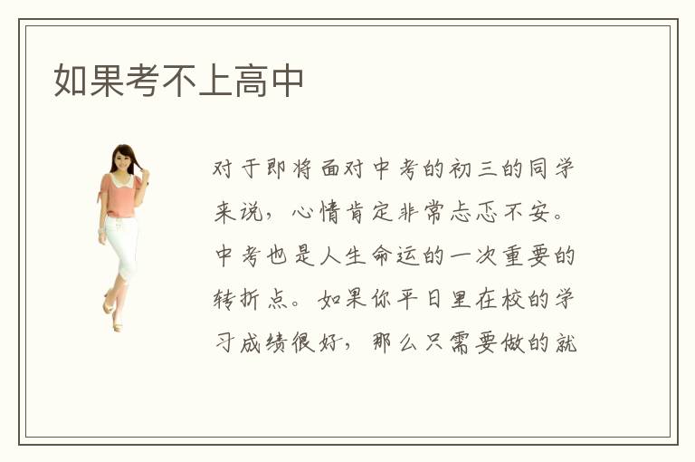 对于即将面对中考的初三的同学来说,心情肯定非常忐忑不安。中考也是人生命运的一次重要的转折点。如果你平日里在校的学习成绩很好,那么只需要做的就是认真复习,放松心态,准备应考。如果成绩非常不好,那么就更应该学会放松自己,趁这个时间尽量找到自己哪个学科的成绩是短板,然后抓紧补习。考试时拿出最好的状态就好。最后就算如果考不上高中,也不要气馁,因为还是有很多方法可以继续上学的。如果考不上高中怎么办,如果考不上高中还有出路吗?一般来说,有以下几条路:一是复读初三,准备参加第二年的中考。二是选择职业高中。应届初中毕业生正好属于职高的招收对象, 此时报名正是合适的时机。三是选择技工学校,掌握一门实实在在的谋生技能。一般技工学校毕业后,可以凭学校颁发的职业技术资格证直接步入社会上岗就业。同学们可以根据自身情况,妥善选择。