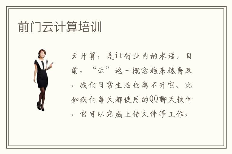云计算,是it行业内的术语。目前,“云”这一概念越来越普及,我们日常生活也离不开它。比如我们每天都使用的QQ聊天软件,它可以完成上传文件等工作,就是“云”这一概念的具体化。包括我们使用网盘来分享和上传文件,也是“云储存的”具体实际应用。说到底,无论云计算还是云储存等等概念,他们都是基于互联网发展的产物,并不是一个独立的行业。想彻底理解学习云计算这一概念,那么就是应该先去学习it。前门云计算培训。在前门附近地区,有多家专业从事it教育的培训机构。如果想从事云计算等工作,那么可以从基本的it知识开始学习。前门云计算培训班怎么样?现在市面上的培训机构种类繁多,各种广告宣传令人眼花缭乱,难以做出正确的选择,不知道哪家的教学质量更好。其实,我们在选择培训机构时不能只看广告宣传,而是自己多去实地了解,亲自感受一下教学环境以及教师的教学水平等等问题。只有认真地去了解,才能选择出适合自己的学习的培训机构。总体来说,只要是正规的培训机构,的教学质量基本都是有保障的。他们区别在于,每家培训机构老师的教学风格不同。前门云计算培训就业。云计算在目前属于热门行业。主要优势有点:1,好就业,2,工资高。笔者认为如果想从事相关行业,是一种不错的选择。