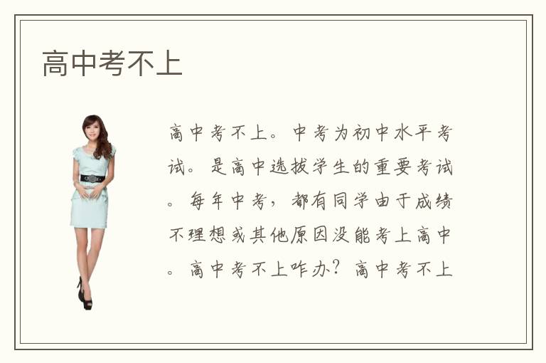 高中考不上。中考为初中水平考试。是高中选拔学生的重要考试。每年中考,都有同学由于成绩不理想或其他原因没能考上高中。高中考不上咋办?高中考不上能上学吗?其实高中考不上还是有很多出路可供同学们选择的。这里笔者只简单说几种。一:复读初三,然后再考高中,最后上大学。这个方法比较适合偶尔状态失常,考试没发挥出平常成绩而导致落榜的同学。如果本身成绩就不是很好,那么这个方法并不推荐。二:读职高,职高即为职业高中。一般招生条件为应届初中毕业生。职高在级别上与普通高中无异,都属普通高级中学。在校期间课程上,职高为专业与文化课并重,除专业课程外,文化课也是平常学习的一方面内容,而普通高中则更注重学生文化水平的教育。职高毕业的同学可以参加对口高考,一样能上大学。三:上技校。技校就是我们说的技工学校。技校的办学宗旨在于专业技能的教学,让学生掌握一门谋生技能,对于文化方面,要求比较低。所以入学条件非常宽松。但是高级技校毕业的同学是有资格参加高考的,一样有机会上大学的。所以,具体怎样选择同学们可以根据自身情况考量。