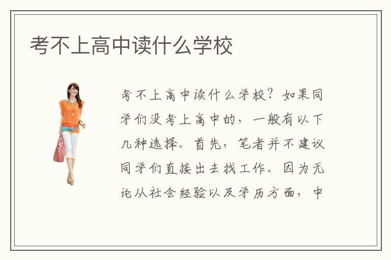 考不上高中读什么学校?如果同学们没考上高中的,一般有以下几种选择。首先,笔者并不建议同学们直接出去找工作。因为无论从社会经验以及学历方面,中学毕业的话是根本没有竞争力的。只能从事简单繁重的劳动,收入低微。一定要在这人生中最好的年纪里学习一项谋生技能。考不上高中可以读什么学校?一,同学们可以考虑复读,然后再参加中考。二,如果你是应届初中毕业生,那么可以读职业高中。三,可以上中专学校,学习专业技能。四,上职业技术学校,也就是我们常说的技校。考不上高中读什么学校好?如果不想复读的话,那么职业高中、中专、技校都是不错的选择。现在国家对专业人才的需求量很大,如果有一技之长找工作还是不难的。所以专科生还是比较好就业的。具体怎样选择,同学们可以根据自身成绩做决定。