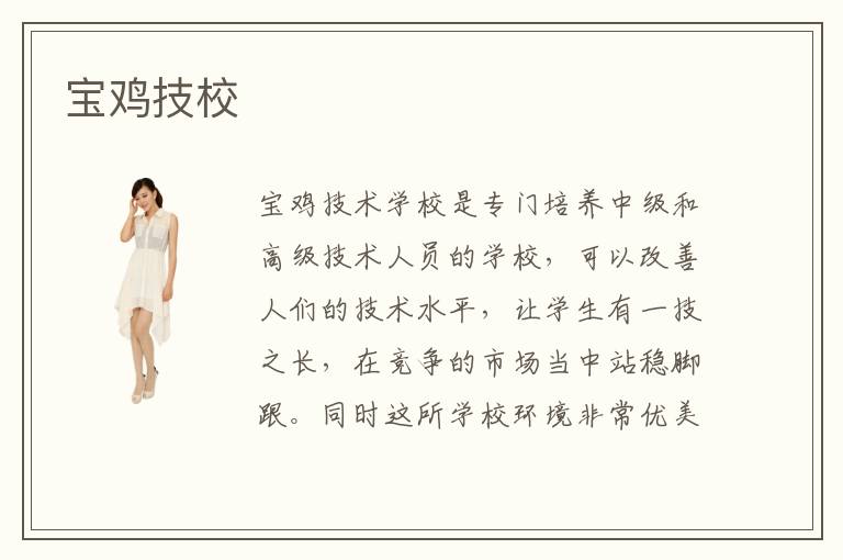 宝鸡技术学校是专门培养中级和高级技术人员的学校,可以改善人们的技术水平,让学生有一技之长,在竞争的市场当中站稳脚跟。同时这所学校环境非常优美,交通便利,同时也是国家综合的职业培训基地,是办学的示范性院校。宝鸡技校氛围拥有完善的设备,包括教学楼,图书馆,实验室以及实训中心,数据变成中心计算机中心,建筑面积高达4万多平方。同时这里拥有多个专业,包括计算机应用,电子计算机维修,汽车训练场,汽车维修,机械加工,数控编程中心等等。宝鸡技校的师资力量是非常雄厚的,有200多名教职员工,其中有25名高级职称的教师,非常重视师资的建设,期待一批优质的教学团队和技术骨干,投资大量的教学设备和资源,带领学生走向更加光明的未来,教学成果优越。