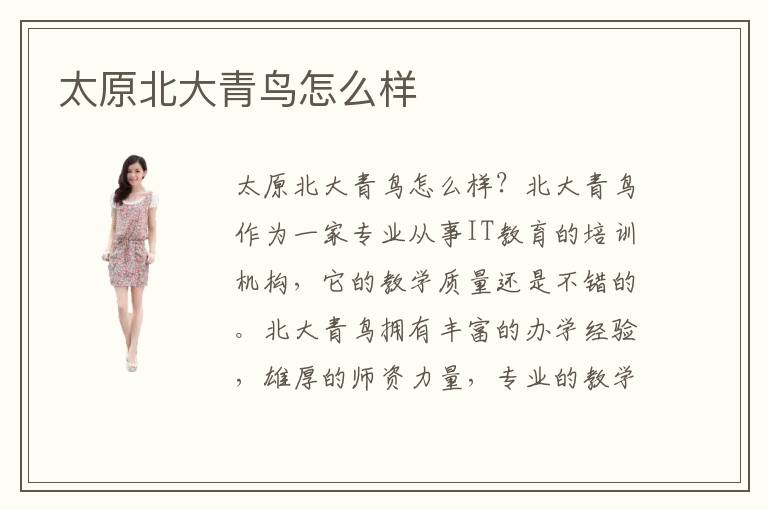 太原北大青鸟北大青鸟怎么样?北大青鸟作为一家专业从事IT教育的培训机构,它的教学质量还是不错的。北大青鸟拥有丰富的办学经验,雄厚的师资力量,专业的教学队伍。并且多次获得国家级奖项,和多家国内著名企业均有合作。自学校成立之初到现在,已经累计培养学生八十多万,为国家和社会输送了大量IT人才。可以说无论在教学成果还是学校口碑方面都是很好的。这里要说明一下,北大青鸟属于全国连锁的教育机构,在我国各大省市均设有分校。山西省的分校就是在太原市内。地址是太原市阳平路。太原北大青鸟收费高吗?其实北大青鸟作为全国连锁的培训机构,在学费方面的标准都是相同的,分校区和北京总校区的学费都是一样的,没有任何差别。这方面同学们可以放心。