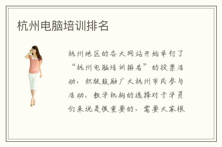 杭州地区的各大网站开始举行了“杭州电脑培训排名”的投票活动,积极鼓励广大杭州市民参与活动。教学机构的选择对于学员们来说是很重要的,需要大家根据各大培训机构的口碑问题、师资力量以及教学水平等各个方面,进行反复比较,从而选出最具有实力的几家计算机培训机构。很多培训机构还开设了免费的一周试学课程,欢迎大家前去实地体验一下再做出选择。