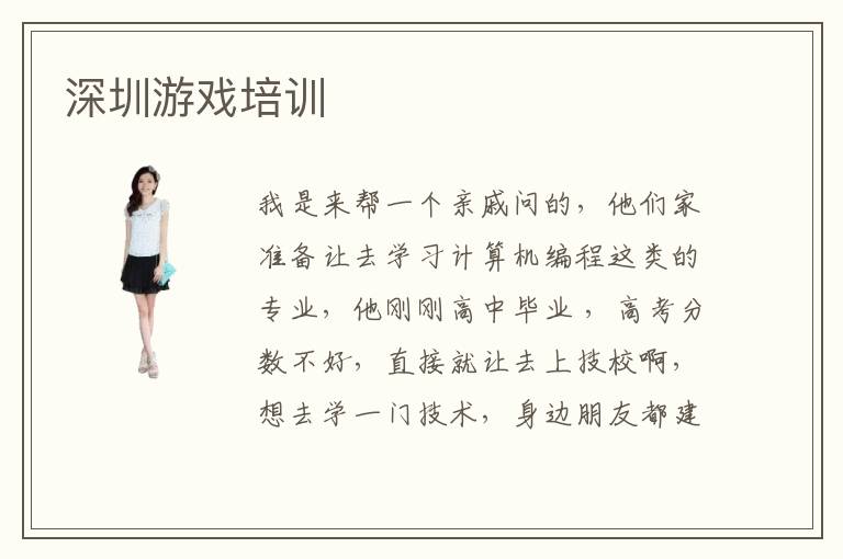 我是来帮一个亲戚问的,他们家准备让去学习计算机编程这类的专业,他刚刚高中毕业 ,高考分数不好,直接就让去上技校啊,想去学一门技术,身边朋友都建议去学习编程这方面的,因为近期这方面的人才需求量大,后期就业薪资待遇当然会不错的,深圳游戏培训还是有很多可以选择的,之前我听过青岛北大青鸟这个学校,不知道深圳这边有没有,是说还不错,线上线下都可以学习的,就我了解的现在的软件学校除了学习游戏,游戏有大数据分析,网站建设,网页设计都是有的啊,你想了解深圳游戏培训有那些,直接搜索一下就会出现好几个呢,或者搜索深圳某专业,也会有很多结果的,看看大家对那些评价好一点,就去他们网站问一下啊,一般官网都有专业介绍课程介绍的,如果自己还是不清楚,直接问在线客服哈哈,相信你一定听过三个月速成班,零基础学习这类的宣传的,不得不说有一些就比较夸张了,这样的速成班估计是适合学习能力强的人,或者有一定基础知识的人,对于零基础的学者,可能接受能力不会这么快了,我还是相信欲速则不达这句话,学习是日积月累的事情,不能过于激进派,深圳游戏培训当然也有这些类似的宣传的,小作坊也不能排除,当然深圳游戏培训中有一部分学校还是不错的呢,我就不一一列举了,据我了解一般大机构都有自己的软件的,他们有这方面的软件开发投资,一方面是内部学员学习,一方面也是通过流量赚钱啊,我之前下载了一个游戏编程的软件,在手机上学习还是方便的,可以学习完相关知识后进行测试,下一次打开也会有上一节知识回顾的,还是比较适合上班族,学生的现在各种各样的培训学真的是越来越多了,小到婴儿的早教班啊,这些培训机构真的是无孔不入啊,当然也有一些是大机构,学习各方面可以有保障,我听说一些小作坊比较坑的,收费不透明,报名费交过之后后期还要什么费用,人家收费还打着某一名义,让你没法拒绝那种,深圳游戏培训应该有这类的吧,但愿大家不遇到,毕竟现在各类培训班参差不齐,监管力度不够啊,避免不了一些小作坊挂着培训机构的牌子就开始赚钱了,如果你想了解深圳游戏培训,不妨先去网上搜一下排名靠前的,然后去他们官网问一下,课程费用介绍看看说法靠谱不,当然你也可以去他们实体店看看的,一般大机构有免费试听的课程的,需要你提前申请预约的,一般培训一年左右可以拿到毕业证啊,还有培训机构说是三个月就可以毕业上岗