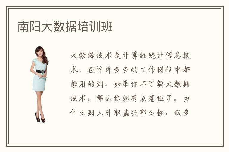 大数据技术是计算机统计信息技术。在许许多多的工作岗位中都能用的到。如果你不了解大数据技术,那么你就有点落伍了。为什么别人升职嘉兴那么快,我多年还在原地不动,就是因为这些人都默默的报培训机构去学习,而你不知道。南阳大数据培训班机构就很不错。在这里学习过的学员都会在自己的工作岗位中取得了个良好的成绩,他们不但升职加薪也跟着有所提升。在这个信息蓬勃发展的时代,你要是掌握不了一门技术,怎么去和别人南阳大数据培训大数据培训班学费拼。南阳大数据培训班结果就是为了帮助你完成心愿而建立的。南阳大数据培训班机构虽然多,但是当他们都是专业的存在。在培养人才方面都是非常有经验的,得到了大多数人的认可。在南阳大数据培训班会使你达到不一样的体验。当你拥有了一门专业技术,还是目前市面上最火的技术。你就会发现你的人生从此开了个南阳大数据培训班怎么样挂。大数据技术是最近这两年新兴的技术,也是目前最受欢迎的技术之一,现在有很多上班族都在学习大数据技术,为的就是得到更好的工作岗位。而南阳大数据培训班技术是比较先进的,有很多人都在这里学习。大数据技术是最火爆的技术从事这个行业的人员工资非常的高不会低于6000待遇也很不错,所以才会有那么多的人对大数据技术充满了浓厚兴趣想要了解大数据技术。在这个电子信息蓬勃发展的时代要是没有一门专业技术是不好找到一份另自己满意的工作的。而学习大数据技术最关键的就是去专业的地方进行系统的培训,这样才能更快更好的掌握大数据技术而南阳大数据培训班就很不错。现在大多数人都在学校大数据技术你要是跟不上脚步不去学习的话就落后了。不想别人永远压你一头就好好学习大数据技术。信息化和智能化的今天,大数据可以说是为社会的高速化发展做出了很大的贡献了。南阳大数据培训班机构非常多,这里推荐几所办学成果优良的培训机构,有:南阳北大青鸟,兄弟连,甲骨文这三所。这几年在办学上质量不断提升,并且与企业开展实际项目,为在培人员提供了很好的就业资源,项目资源和经验教训,等到了普遍的好评。这三所南阳大数据培训班机构的培训学费大概在8000-10000之间,培训周期5-6个月,集中高效。可以说适合社会各阶级的人,提供方面的专业培训。另外普及一下大数据的定义,大数据的主要作用和价值在于对海量数据进行有效化的整理和存储并且输出有意义的有效的信息,省去了信息的冗余。市面上关于大数据的相关职位有:大数据架构师,大数据工程师均是大数据行业的高薪职位。